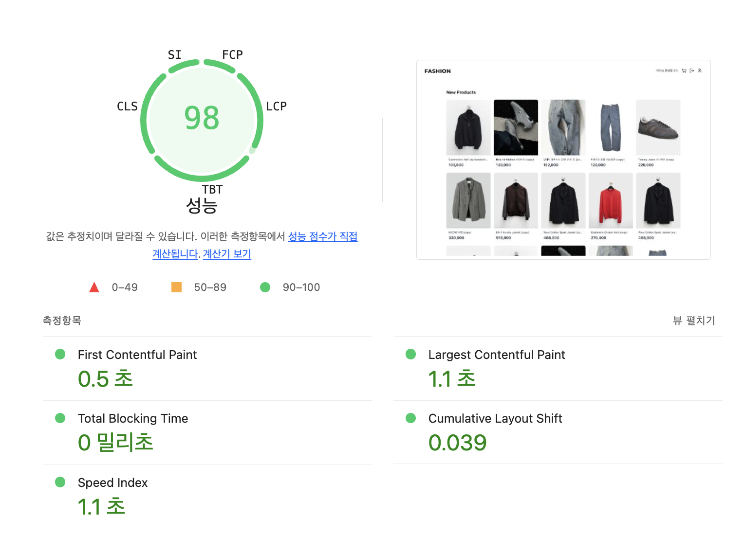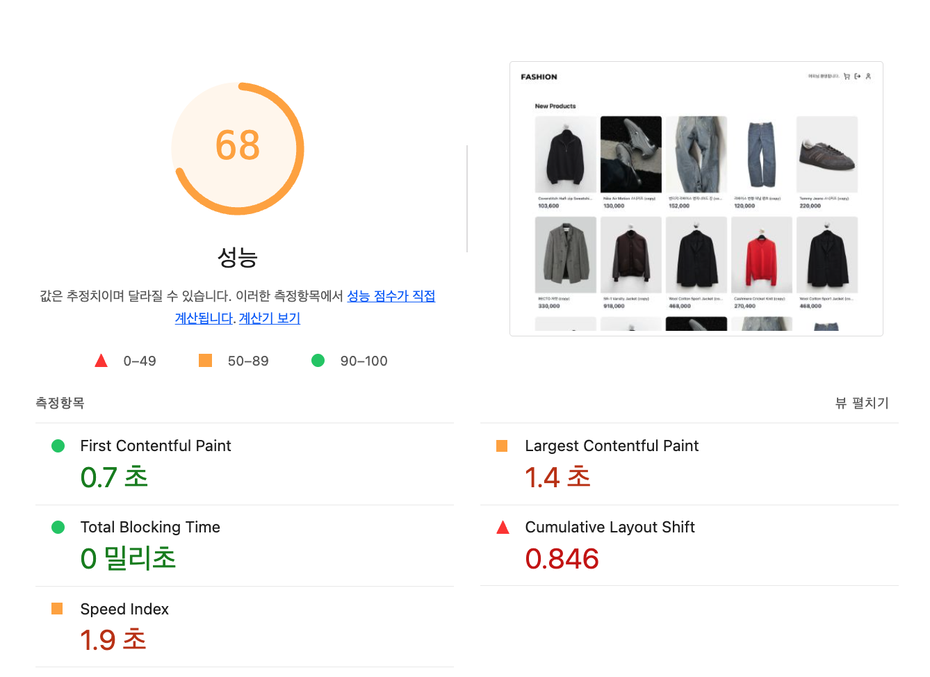 상품 데이터를 100개 추가한 뒤 Lighthouse 검사를 진행했습니다. 데이터가 늘었으니 자연스럽게 LCP가 큰 문제일 것이라 예상했어요.